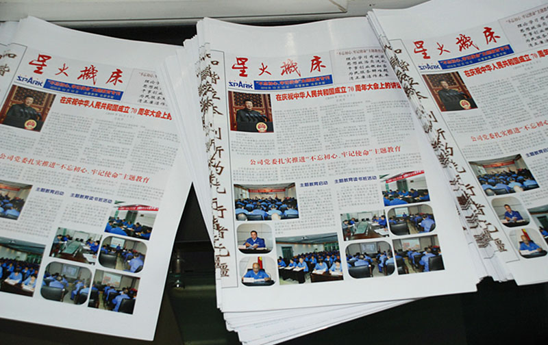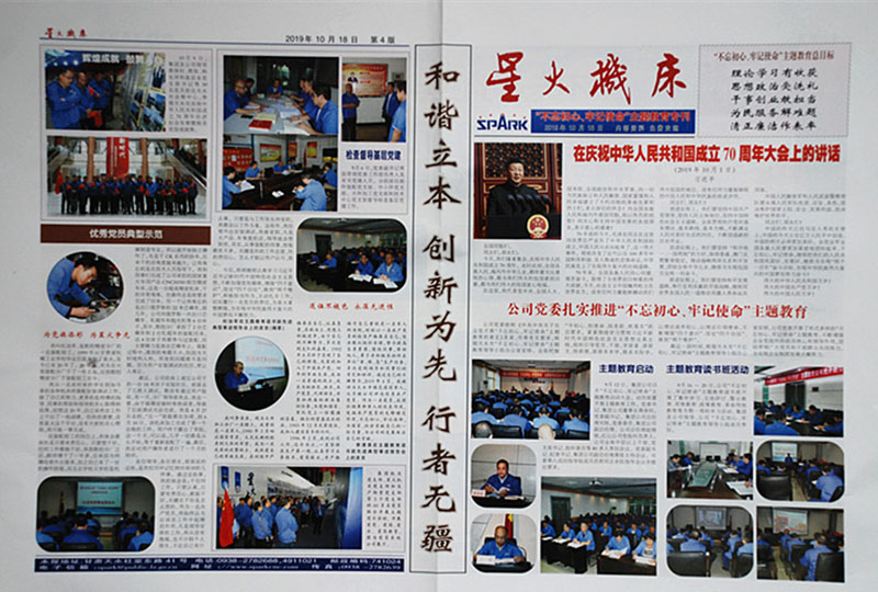 為使“不忘初心、牢記使命”主題教育往深里走,往實(shí)里做,幫助廣大黨員學(xué)懂弄通習(xí)近平新時(shí)代中國(guó)特色社會(huì)主義思想,掌握精髓,激發(fā)斗志,指導(dǎo)行動(dòng)。10月18日,經(jīng)過認(rèn)真準(zhǔn)備的星火機(jī)床《“不忘初心、牢記使命”主題教育??泛蛷V大黨員見面了。本期??晒军h委工作部部長(zhǎng)、公司“不忘初心、牢記使命”主題教育領(lǐng)導(dǎo)小組辦公室主任姚保忠策劃,黨委工作部有關(guān)人員精心組織稿件、選擇圖片進(jìn)行編排。??粤?xí)近平總書記在慶祝中華人民共和國(guó)成立70周年大會(huì)上的講話為統(tǒng)領(lǐng),分欄目反映了公司“不忘初心、牢記使命”主題教育動(dòng)員部署大會(huì)、主題教育讀書班、慶祝新中國(guó)成立70周年歌詠比賽,市委“不忘初心、牢記使命”主題教育第八巡回指導(dǎo)組指導(dǎo)檢查、專題黨課、“不忘初心、牢記使命”主題教育知識(shí)競(jìng)賽,黨支部書記參加全市“不忘初心、牢記使命”主題教育培訓(xùn),公司黨員參觀全市慶祝新中國(guó)成立70周年成就展,公司黨委檢查督導(dǎo)基層支部黨建工作,以及公司主題黨日活動(dòng)和優(yōu)秀黨員事跡介紹等。專刊彩色印刷,以圖為主、圖文并茂,既是對(duì)公司開展“不忘初心、牢記使命”主題教育的全面報(bào)導(dǎo),又是廣大黨員掌握主題教育動(dòng)態(tài)、開展學(xué)習(xí)的輔導(dǎo)材料,受到了黨委領(lǐng)導(dǎo)的肯定和黨員的好評(píng)。