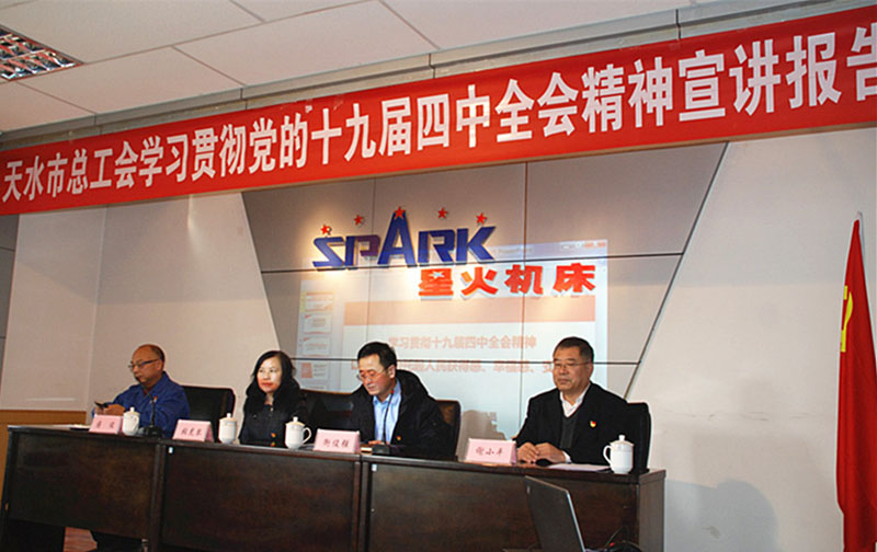 1月7日,天水市總工會學(xué)習(xí)貫徹黨的十九屆四中全會精神宣講報(bào)告會在星火機(jī)床公司舉行,天水市總工會邀請中共天水市委宣講團(tuán)成員、甘肅林業(yè)職業(yè)技術(shù)學(xué)院教授謝小平為星火機(jī)床公司黨支部書記、分會主席和部分員工作了《以制度優(yōu)勢托起人民獲得感、幸福感、安全感》為主題的黨的十九屆四中全會精神學(xué)習(xí)專題宣講報(bào)告。天水市總工會黨組成員、副主席張虎琴,副主席衡俊強(qiáng),星火機(jī)床公司黨委副書記、工會主席蔣俊及各黨支部書記、分會主席和部分員工80多人參加了報(bào)告會。衡俊強(qiáng)主持報(bào)告會。