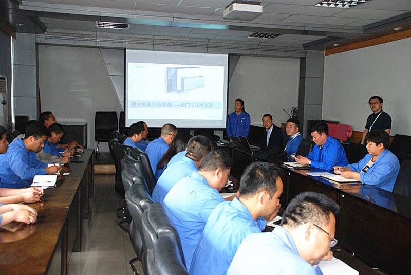 為提升專(zhuān)業(yè)技術(shù)人員專(zhuān)業(yè)知識(shí)技能,熟練使用西門(mén)子數(shù)控系統(tǒng),進(jìn)一步了解西門(mén)子變頻器及低壓控制類(lèi)電氣元件的性能,提高工作效率。5月19日下午,星火機(jī)床公司邀請(qǐng)西門(mén)子公司專(zhuān)業(yè)技術(shù)團(tuán)隊(duì),來(lái)公司舉辦西門(mén)子數(shù)控系統(tǒng)知識(shí)講座。星火機(jī)床集團(tuán)公司總經(jīng)理、星火機(jī)床研究院院長(zhǎng)劉勝,星火機(jī)床研究院常務(wù)副院長(zhǎng)展海瑜及設(shè)計(jì)工藝、電氣調(diào)試、售后服務(wù),各單位電氣調(diào)試維修人員20多人參加培訓(xùn)。