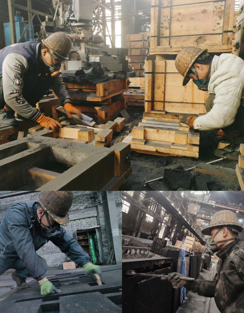 在鑄造公司,師傅們佩戴防護(hù)口罩,為趕制砂芯而爭分奪秒。有造型的,有填砂的,有刷涂料的………忙的不亦樂乎。