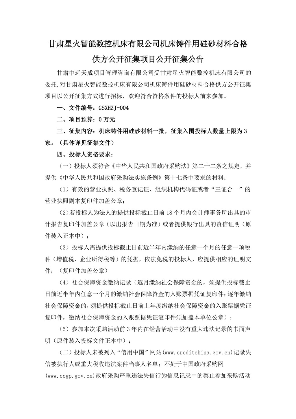 甘肅星火智能數控機床有限公司機床鑄件用硅砂材料合格供方公開征集項目公開征集公告